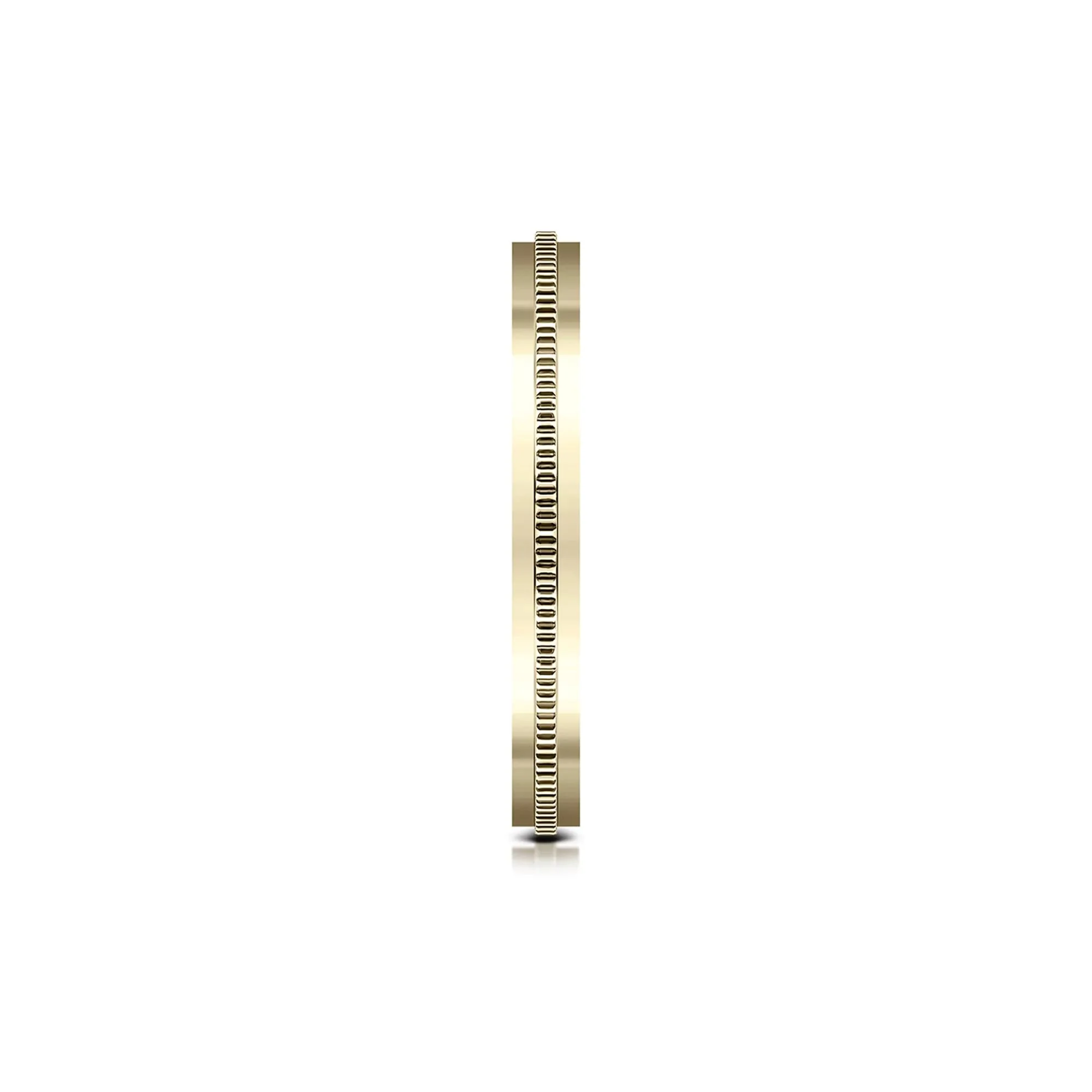 Materials: This 2mm yellow gold wedding band is handcrafted from solid 14K yellow gold and features decorative milgrain edges in size 12.5.