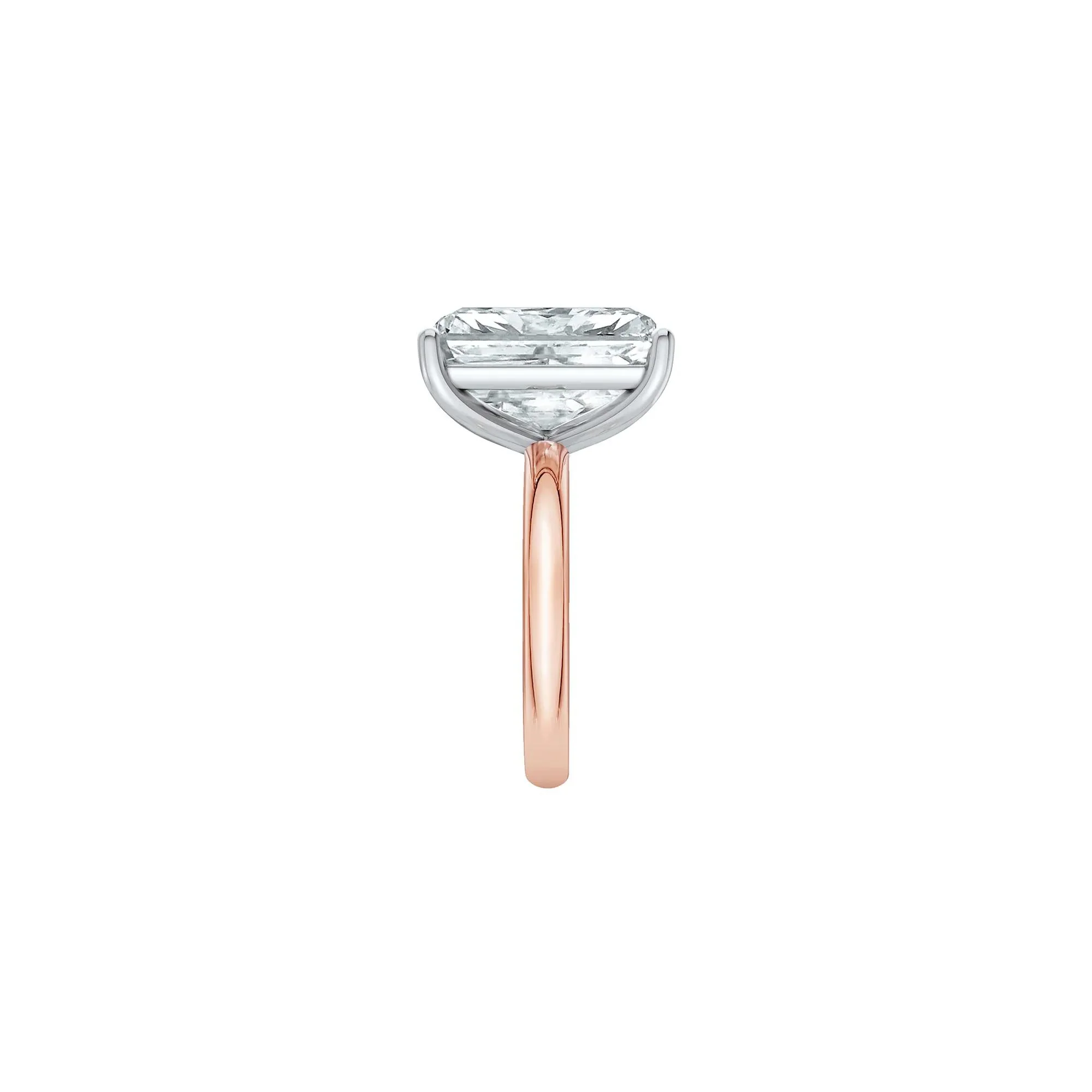 Materials: Featured in 14K rose and white gold, this ring showcases a 7-carat radiant-cut lab grown diamond in size 11.5.