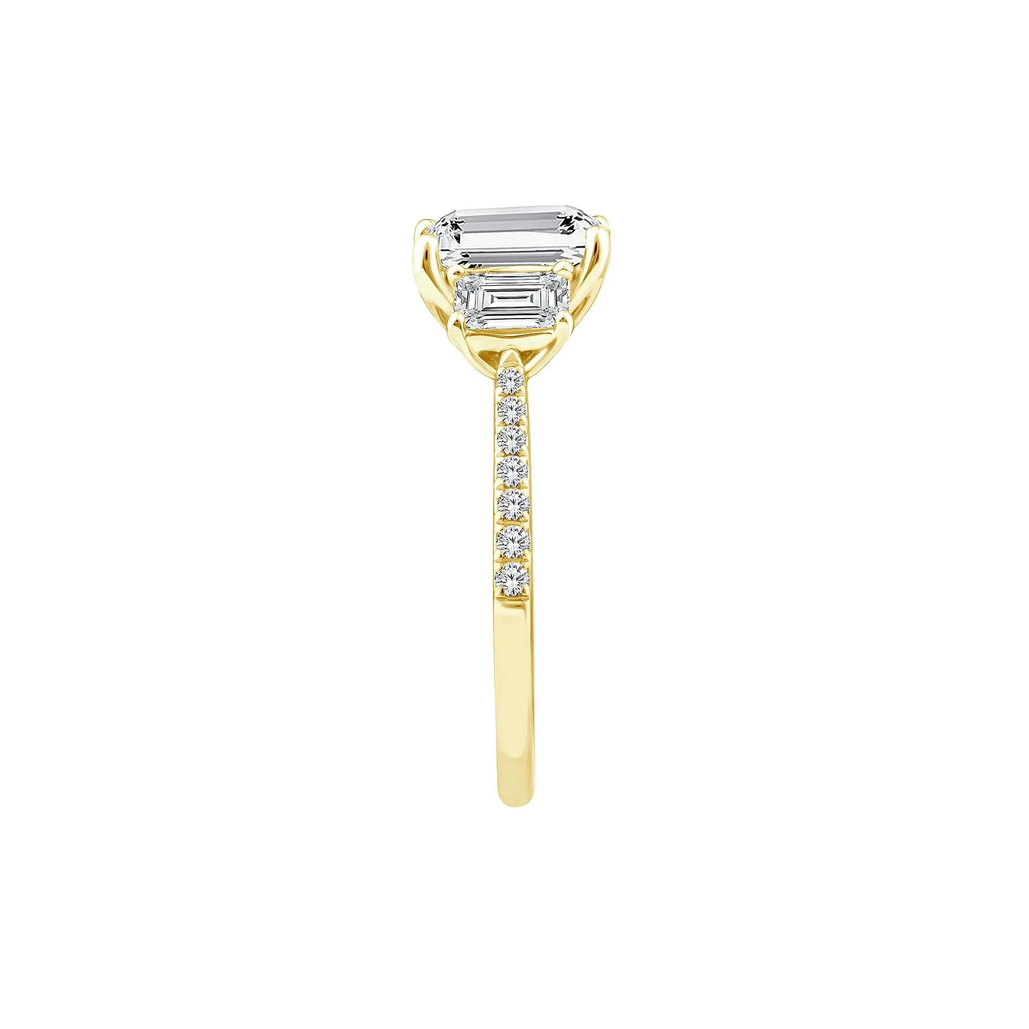 Materials: Crafted from solid 14K yellow gold, this ring features a 2.00 ct. emerald-cut center stone, two 0.50 ct. side diamonds, and 32 round brilliant-cut lab-grown diamond accents, size 7.5.
